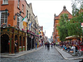 There are shops and restaurants lining the streets from the station to the